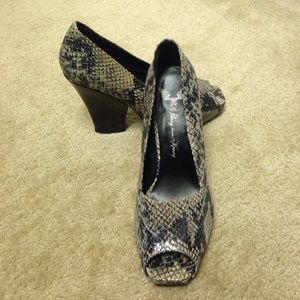 Snakeskin style peep toe- thick 70's heel. Super comfy
