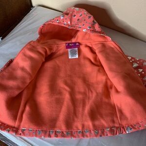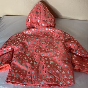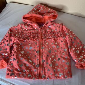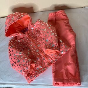 EUC. Penny M By Penelope Mack Fleece Lined Jacket & Pants Set Size 18 Months. Coral in color with silver metallic stars and hearts on jacket.