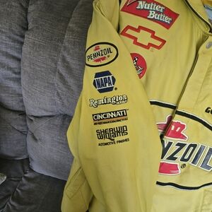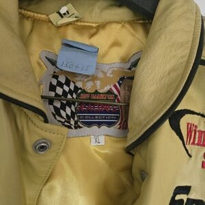 Yellow Pennzoil leather racing jacket with various sponsor patches. Features bold Pennzoil logo on the front.