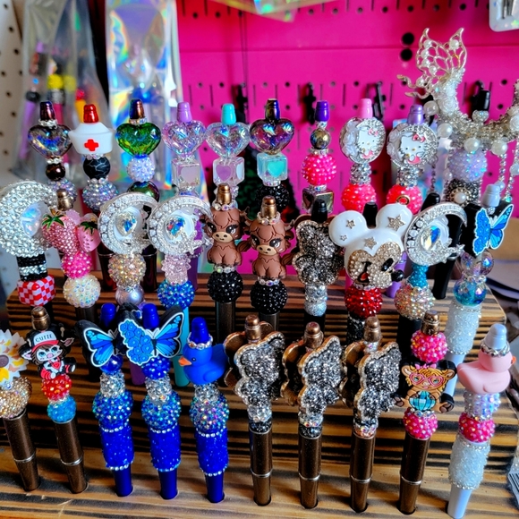 I have handmade pens available. Either twistable open to close. Made with beautiful acrylic rhinestones and silicone. Each has its own flair. They are made differently and with different color pens.