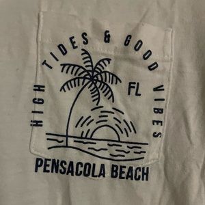 Pensacola Beach FL V-Neck Pocket & Back Graphic T-Shirt. White shirt with 2 black stripes around each sleeve and solid black lining the neck. Black graphic design “HIGH TIDES & GOOD VIBES PENSACOLA BEACH FL” on front pocket (small) and back of shirt (large).