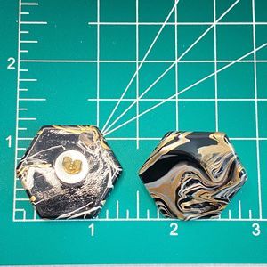 Pentagon Button Earrings Celluloid Acetate 3D Gold Black White Swirl Studs
