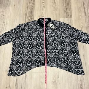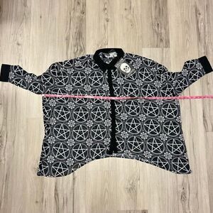 New with tags. Pentagram ladies sheer shirt by Killstar. Black and white floral star pentagram print blouse with box cut style. Hidden button up front. Drop style sleeves with button cuffs. Size XL. Selling because of weight loss. Measurements in photos