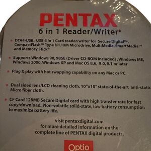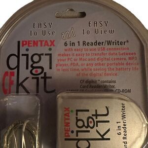 Pentax Digikit - for transferring photos to PC. Kit includes 6 in 1 plug and play card reader/writer to transfer data to and from PC/Digital camera, lens cloth, Sandisk 128mb compact flash. There is a cd rom included but please see compatability of programs on back of package.