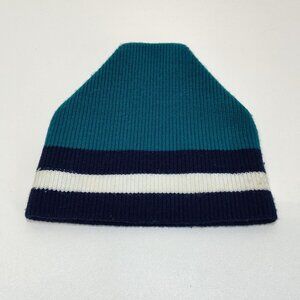 This vintage knit beanie, crafted by Penthouse Knits in the USA, showcases a timeless design with its striped pattern in green, blue, and white