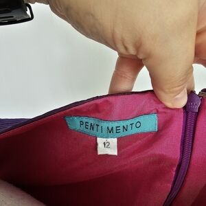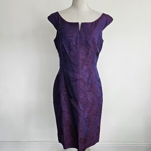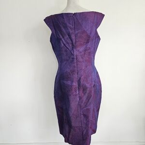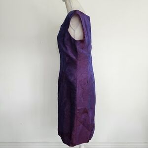 Pentimento purple/pink iridescent sheath dress with notched neckline, crinkle fabric pattern, hem split, and back zipper.