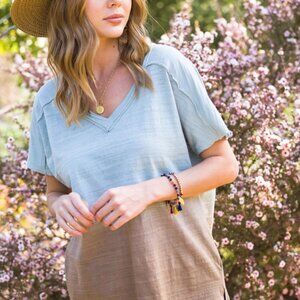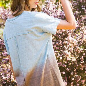 Take the plunge into the dip-dye trend with this fun top! This vintage jersey top is incredibly comfortable, designed with an easy going relaxed fit and a unique dip-dye style. It features short sleeves, V neckline, side slits, out seam detailing throughout and raw edge finish.