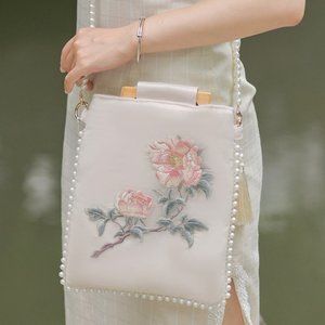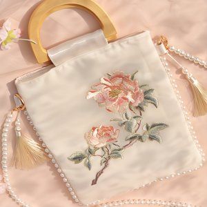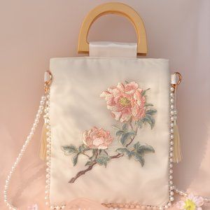 Embrace the retro vibe and stand out with our peony embroidery shoulder bag. Made of mercerized cotton, renowned for its smooth and silky texture. Exquisite peony embroidery Detachable shoulder pearl chain Wooden top handle 2-in-1 design offers versatility - use it as a handbag or shoulder bag. #37