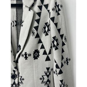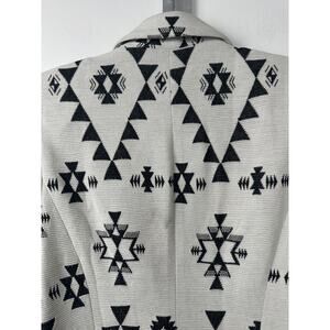 The People Like Frank Anthropologie cardigan for women in size 4 features a classic black and gray geometric print, tight-knit design, collared neckline, and long sleeves. With a button closure, this sweater is perfect for travel, casual, workwear, and business occasions. Made from a polyester-cotton blend, this cardigan also includes pockets and is machine washable for easy care. The multicolor design and Aztec, Bohemian, and classic themes make it a versatile piece for various seasons.