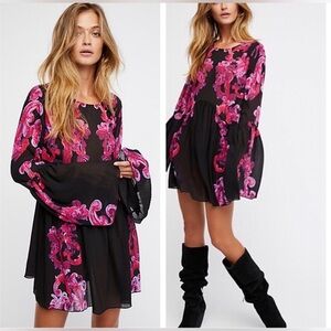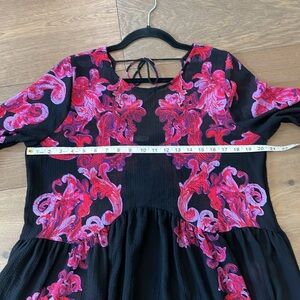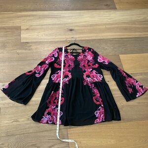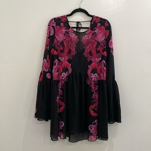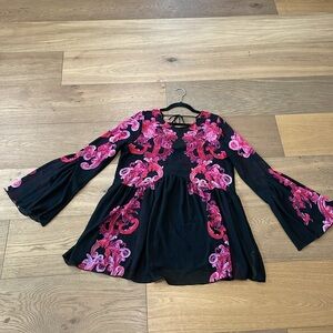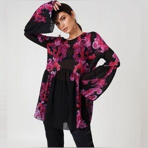 Lightweight, textured and printed flowy slip featured in an oversized silhouette. Long bell sleeves. Adjustable tie at the back neck. Sheer. Machine Wash Cold.