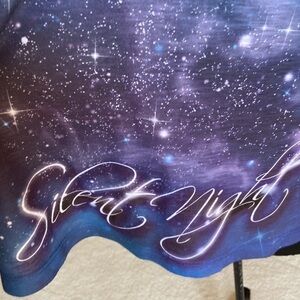 The blue and white starry night design creates a whimsical and magical vibe, capturing the essence of the holiday season. "Silent Night" is beautifully written at the bottom front of the top.