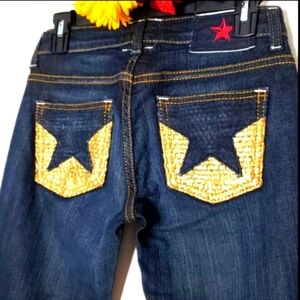 Anthropologie People Liberation Star Imprint on Back Pockets finished in Gold Sequins! Dark Blue Flare Jeans!