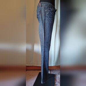 boot cut style blue denim very lightly distressed Tanya see pictures. they are part of the description. there is purposeful wrinkles in the legs and a purposeful line mark in the denim on the left leg. very light wear on the bottom of the hems at the ankles. double back pockets with star button closures. zipper fly with star button. front pockets with coin pocket. in great pre-owned condition. pretty darn close to new. signature brand fabric pockets.