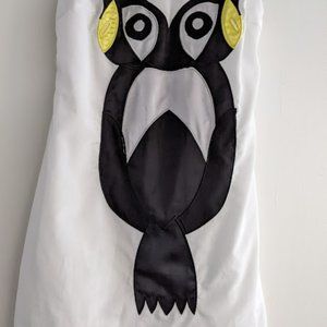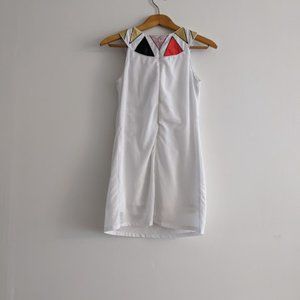 People's Market white dress. The dress has a large black owl on the front. There are triangles in various colors along the collar. The dress is fully lined. There is a zipper down the middle of the back of the dress. This is a striking, show stopping dress! Size small