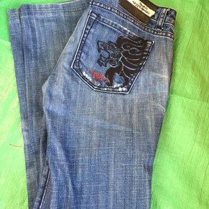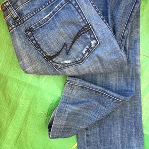 People's Republic brand women's jeans in size 27. Skinny leg, about 33" inseam. No damage. Black and red back pocket design. Light distressing on front. No hem line wear. Great jeans will last forever. Only worn a couple times. Medium to dark denim wash.