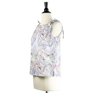 Sleeveless abstract shell print top with round neckline, drawstring tie the top shoulders, fabric-covered buttons along the waist and side slits.