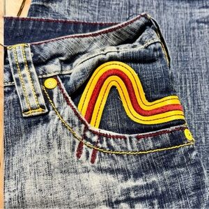 ✨ Vibrant Y2K flare jeans with rainbow swirl embroidery on the back pockets!