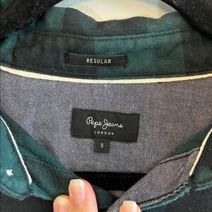 Pepe Jeans plaid shirt in black and green. Features a classic collar and button-up design. Sold as a men’s shirt, but has a unisex cut. Perfect for fall 🍁 and winter ❄️ as it’s heavy duty material.