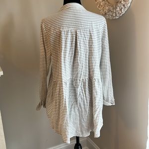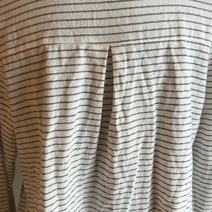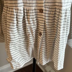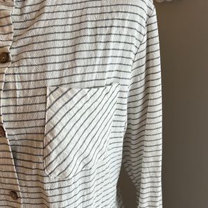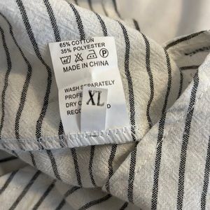 The shirt is adorable and unique! NWOT/never worn: size XL. Has wooden buttons with tab collar. Cotton blend shirt, feels light and cool, almost linen-like. White with black vertical stripes. This is a great top for any season! Also available in light yello/white stripes! Bundle, and save! ☁️✨