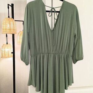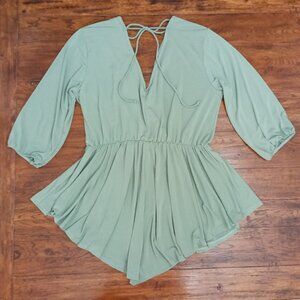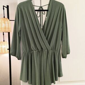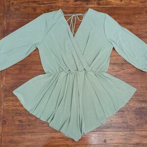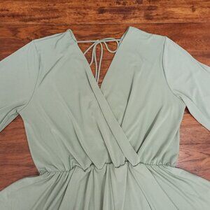 This is a sage green blouse with three-quarter length sleeves, surplice V-neck, tie-back detail, cinched elastic waist with flowing, pleated bottom.