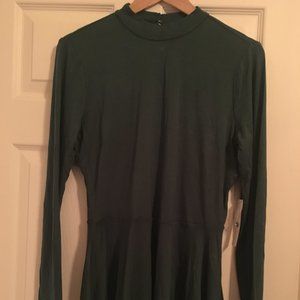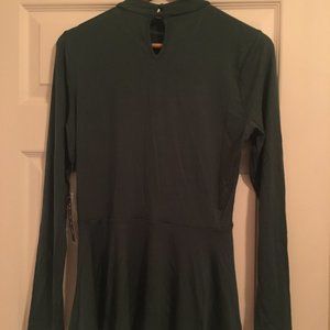 ModCloth Dressy T-shirt with a slight mock-neck, long sleeves, a peplum waist, and keyhole detail at the neck in the back. The color is in the green family and is somewhat of a army green. I would wear it with a pencil skirt or jeans and booties. Fitted through the torso with coverage for the tummy. The peplum is long but not overly full. NWT