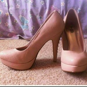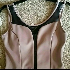 Mocha colored peplum dress. The dress comes down to a few inches above the knee, super classy and stylish! The front had a mesh that goes down the middle. The shoes are also for sale. They are size 10, I wear a 9.5 and it fits, I just have narrow feet so they don't fit quite right.
