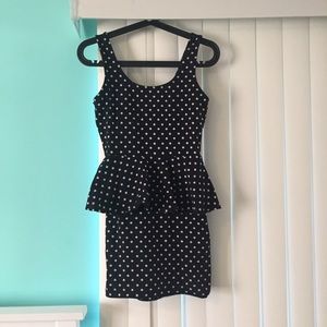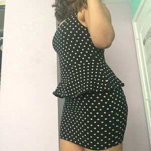 Short mini dress with polkadots from forever21. 92% Cotton 8% spandex. Me and my best friend both got the same size even though she is a small and i wear a size large. Fit us both, so i'd say the size is pretty flexible.