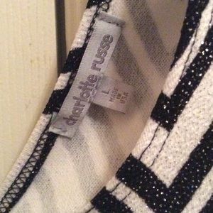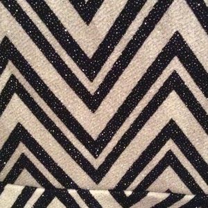 Black and white chevron print top. Peplum hem and opening in back for romantic appeal. Silvery thread woven into fabric for romantic or holiday appeal.