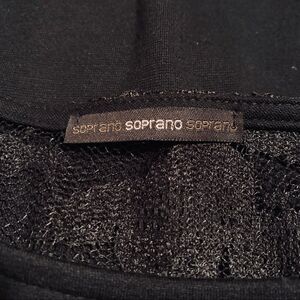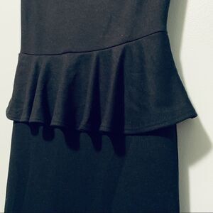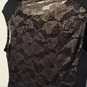 Fitted black dress with a scoop neck and peplum at the waist. Back section has black lace with a gold shine. Fitted pencil skirt bottom and cap sleeves on the top.