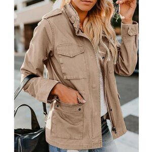 Embrace the essence of adventure with this light khaki military-style jacket. Perfect for layering, it adds a touch of rugged charm to your wardrobe while ensuring comfort and functionality.