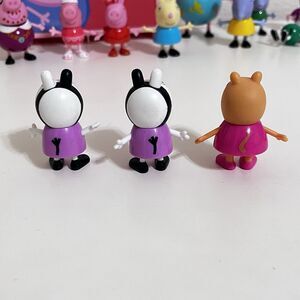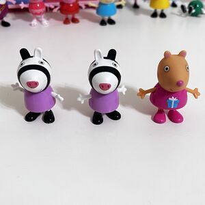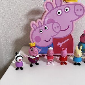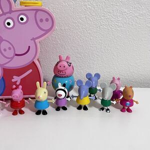 Peppa Pig Carry Along Case + 12 Figures Lot Toys. This listing is for the Peppa Pig carrying case and 12 additional figures. One of the figures I believe is a Duplo Peppa Pig. All the items have been played with a lot, so there is wear and tear, scratches, rubbed off paint, and some larger white spots of the carrying case as well. Please See the Pictures. The figures are from multiple sets, but all fit inside of the case. Far from perfect, but have a ton of life left.