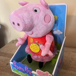 This interactive plush toy giggles, snorts, and laughs out loud while kicking its feet, and also plays the Peppa Pig theme song.