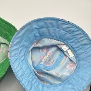 Set of two vibrant bucket hats with playful cartoon designs. One hat is light blue with colorful characters, and the other is green with pink cartoon figures.