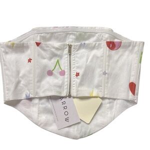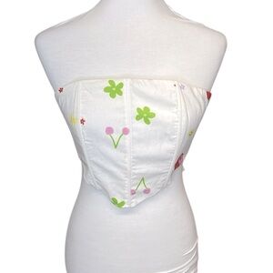 Elevate your wardrobe with this chic white strapless top featuring a playful and colorful print. Perfect for any occasion, this top combines style and comfort effortlessly. Full zipper. Bone in.