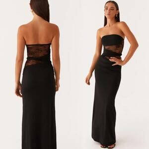 Elegant black maxi dress. Strapless design with lace detail. Perfect for evening wear.
