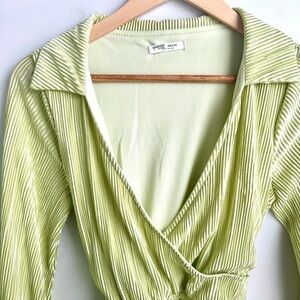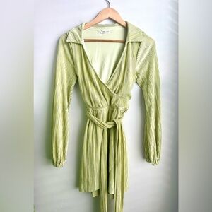 Peppermayo gets you shining all night long in the Dolce Vita Mini Dress. Featuring a silky ribbed fabric, this mini dress is complete with a wrap design that ties at the waist, long balloon sleeves, a collar, and a plunging v-neckline.
