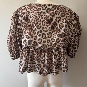 Stylish leopard print blouse. Features ruffled sleeves and front tie details. Perfect for a chic look.