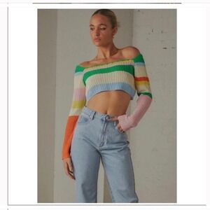 Keywords: Peppermayo, crop top, knit top, striped top, long sleeve, colorful, off the shoulder, festival top, party top, casual top, women's top, S/M, small medium
