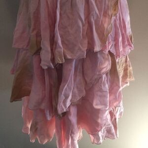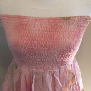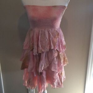 Barely worn layered ruffled skirt on strapless top. Shade of pink and brown Tie Dye. Stretchable Top. . Made of rayon. Could be worn as dress or cover up. Pet and smoke free home.