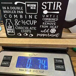 Charming 9 x 8 inch peppermint cocoa sign shaped like a whipped mug! Freestanding and double-sided with chalkboard-style finish—perfect for holiday kitchen or cocoa bar.