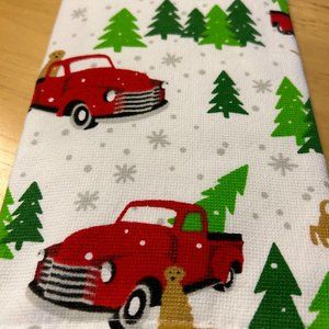 NWT. Peppermint Square set of 2 kitchen towels. The first is the classic red truck w/ tree and dog and "home for the holidays" amid falling snowflakes. The second is all over trucks, trees and dogs. 100% Cotton. Machine wash cold, tumble dry low. Dim: 18" x 26"