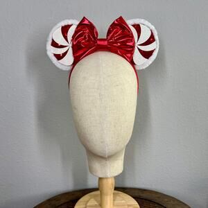 These Disney-inspired Minnie ears are perfect for adding some holiday cheer to any outfit! Featuring sparkling red sequin ears with glittery white peppermint swirls, and fuzzy white trim for an extra dash of winter magic. Topped with a dazzling iridescent red bow, these ears are the perfect accessory for any holiday trip to the parks or festive celebration! 🌟🎀