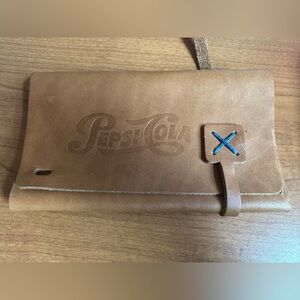 Cool novelty tan leather cord organizer with pocket featuring Pepsi Cola logo. Features a unique blue stitch detail. Ideal for daily use.