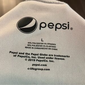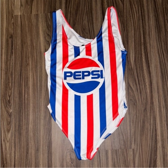 Eye-catching one-piece swimsuit. Features Pepsi logo. Red, white, and blue vertical stripes.