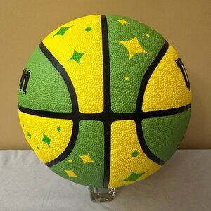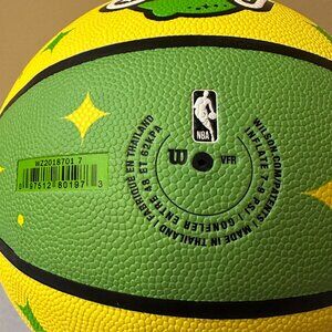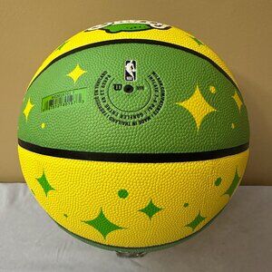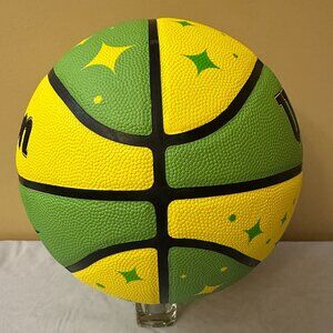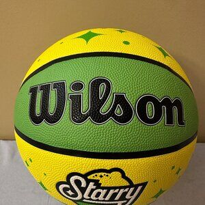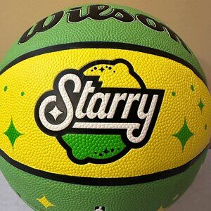This is a Pepsi Starry, NBA Wilson Basketball. The basketball is full sized and is a replica of the official 3 Point Contest basketball. The basketball has never been used and was only inflated for photographs. The ball is in fantastic condition overall with no scratches, rips. etc.. The ball is primarily green and yellow like Starry soda pop and and has the Wilson and Starry logos on one side. The other side features the Wilson and NBA logo with the NBA All Star 3-Pt Contest Replica text and the Commissioner Adam Silver's text signature. The rest of the ball just features Starry starburst patterns. It comes from a smoke free and pet free home and will be packaged and shipped with great care.