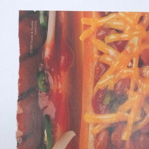 This magazine advertisement promotes Pepto Bismol with a humorous food theme featuring chili cheese dogs and the slogan "Recommended for Dog Bites." Bright colors and playful design make this a fun collectible for retro ad fans and kitchen décor collectors.