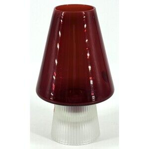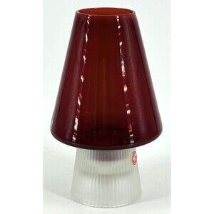 The product is a rare 16 cm "Hygge" lamp for candles in red, designed by Per Lütken for Holmegaard in Denmark. This vintage lamp is made of art glass with a glossy shade and a matte base, reflecting the Scandinavian design style popular in the late 20th century. The lamp is an original production from the 1960s, perfect for indoor use and adding a touch of Mid-Century Modern style to any space.