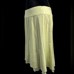 This is gorgeous in person! Leather knee length skirt. Lines and flowy. Yellow in color. No stains or holes. Size 8.