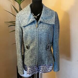 Sz 10 Wool blend Coat Blazer Per Se Blue Carlisle Gorgeous designer jacket from Carlisle Wool's designer line Per Se. Acetate lining, zipper front, shawl collar, tabs with buttons at waist, 2 zippered pockets on front. Sleeves have 7" zippers at cuffs. Fabric is 79% wool, 16% polyamide, 5% alpaca. pit to pit 20