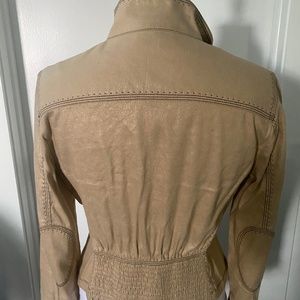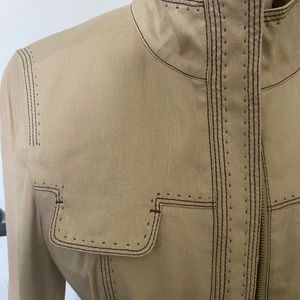 This is a gorgeous James Per Se out of Los Angeles Hand stitched Linen jacket. it's a camel color with gold sheen zip up jacket, with zip cuffs as well. Beautiful brown stitching, including multiple areas of hand stitching. The back has multi level elastic waist to hug and fit you perfectly. Talk about luxury. This jacket screams you have money.Very elegant for a night out or lunch with the girls.
